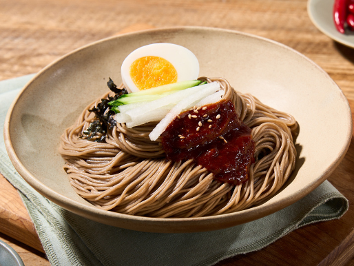 • 재료: 메밀면 1인분, 고춧가루 3T, 간장 2T, 설탕 1T, 식초 2T, 다진 마늘 0.5T, 참기름 1T, 사과즙 2T