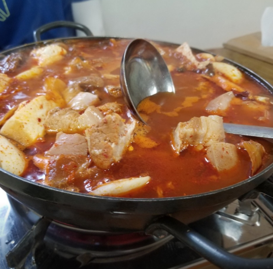 - 재료: 묵은지 1/4포기, 손두부 1모, 돼지고기(앞다리살) 200g, 사골육수 500ml, 대파 1대, 양파 1/2개