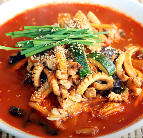 - 재료: 시판 순두부 1봉, 돼지고기 100g, 오징어 반 마리, 양파, 양배추, 고춧가루 3T, 다진 마늘 1T, 사골 육수 600ml