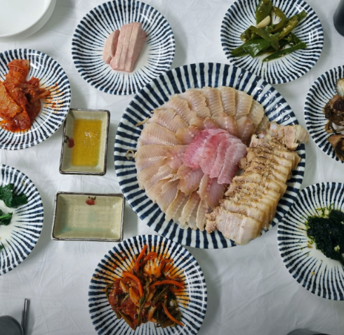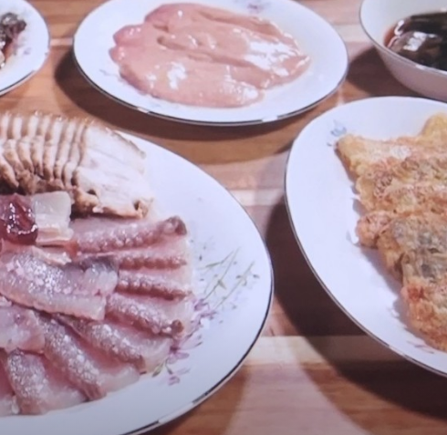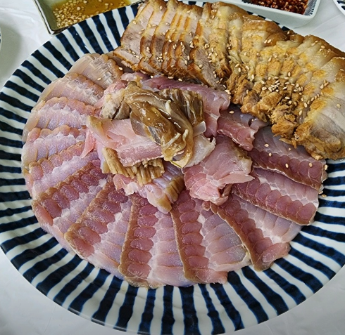 - 조합하기: 접시에 수육, 홍어, 김치를 나란히 담아냅니다.