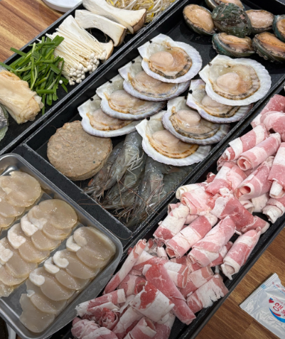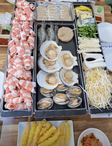 - 재료: 키조개 관자 3~4개, 차돌박이(또는 우삼겹) 200g, 숙주나물 1봉지, 팽이버섯, 부추, 명이나물 또는 쌈무.