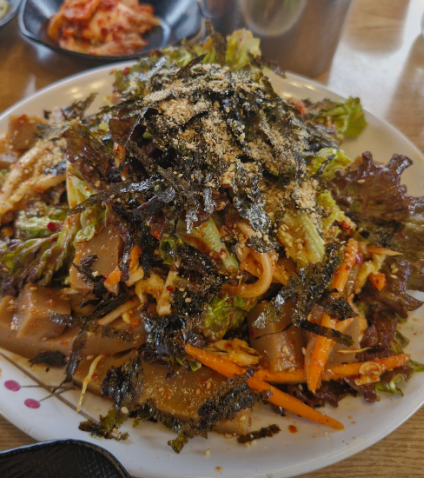 - 재료: 도토리묵 1팩, 신김치 약간, 오이 1/4개, 김가루, 통깨