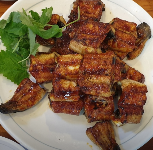 - 3. 장어가 반쯤 익었을 때 준비한 양념장을 덧발라가며 약불에서 굽습니다. 김해 낙동강 3대째 장어구이 느낌을 내려면 양념을 여러 번 덧칠하는 것이 중요합니다.