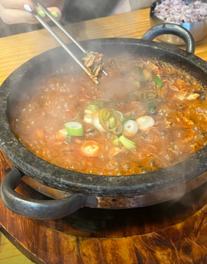 - 5. 마지막에 대파와 청양고추를 넣고 한소끔 더 끓인 뒤 싱싱한 쌈 채소와 곁들입니다.