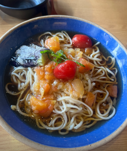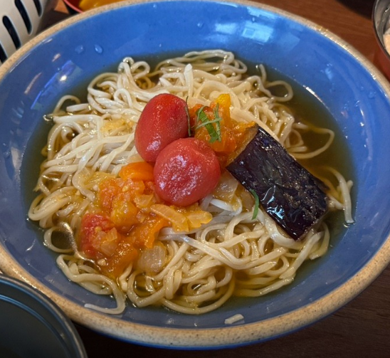 - 재료: 메밀 건면 1인분, 완숙 토마토 1개, 쯔유 육수 250ml, 생강즙 약간, 무순, 연와사비