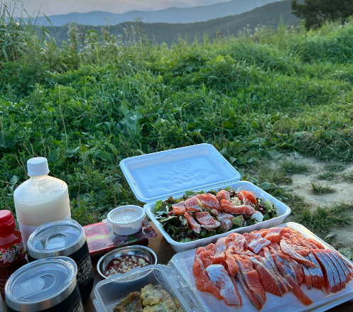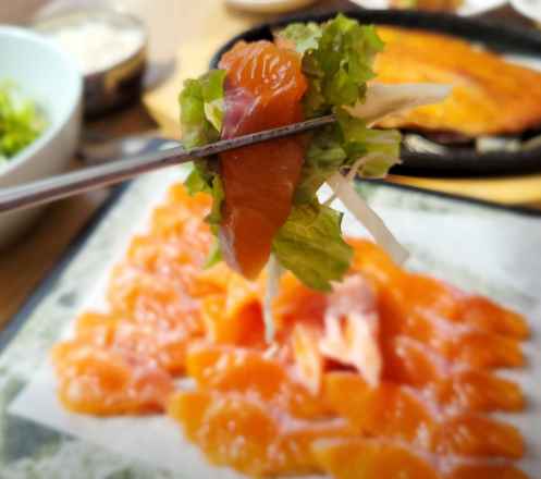 - 준비물: 신선한 송어회(또는 연어), 양배추, 상추, 깻잎, 당근, 쪽파.