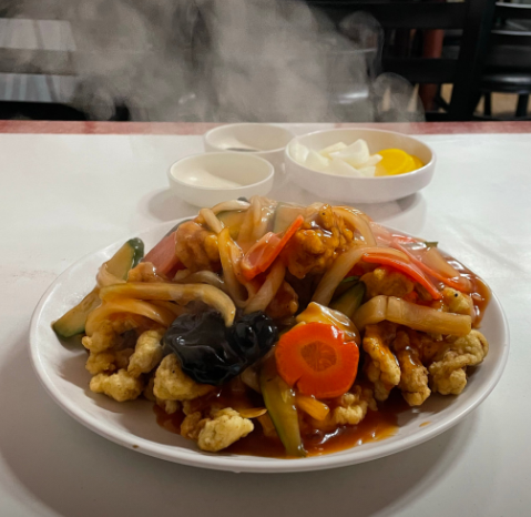 - 4. 갓 튀긴 고기에 소스를 곁들이면 맛있는 은평구 쟁반짜장, 탕수육 스타일의 한 상이 차려집니다.