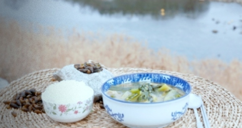 괴산의 맑은 물에서 잡은 다슬기에 된장을 풀고 아욱을 넣어 끓인 다슬기아욱국은 그 국물 맛이 매우 시원합니다. 여기에 민물새우를 듬뿍 넣은 새뱅이탕과 투박하지만 정겨운 찬밥버무리가 곁들여지면 낙지 한 상 이 부럽지 않은 든든한 마을 밥상이 차려집니다.